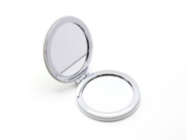 可愛い丸型のミラー。コンパクトなのでバッグやポーチ、ポケットに入れて持ち運べます。旅行や出張のお供にいかがでしょうか。片面が拡大鏡になっているので、細部のチェックに便利です。フルカラー対応可。